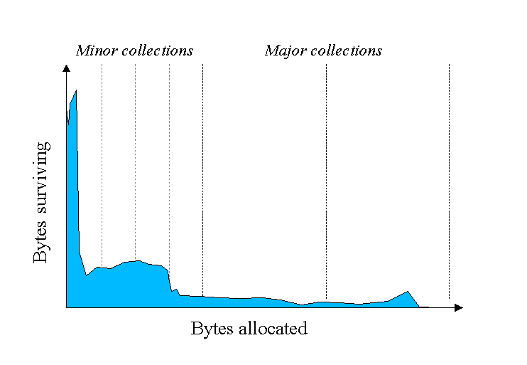 - JVM의 모든 개체들은 확인하고 마킹한 뒤 삭제하는 작업은 계속 할당되는 개체들을 관리하기엔 매우 비효율 적이다. 그러나, 응용프로그램에 대한 경험적 분석에 따르면 대부분의 개체는 수명이 짧다.