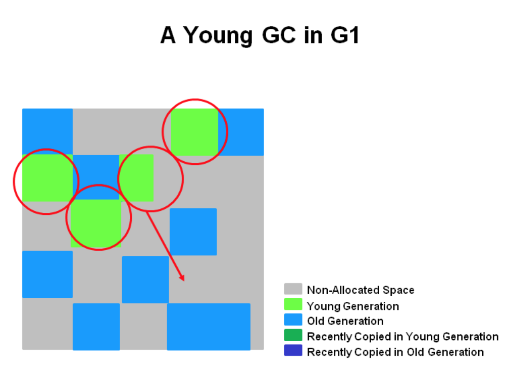 연속되지 않은 메모리 공간에 Young Generation이 Region 단위로 메모리에 할당되어 있다.